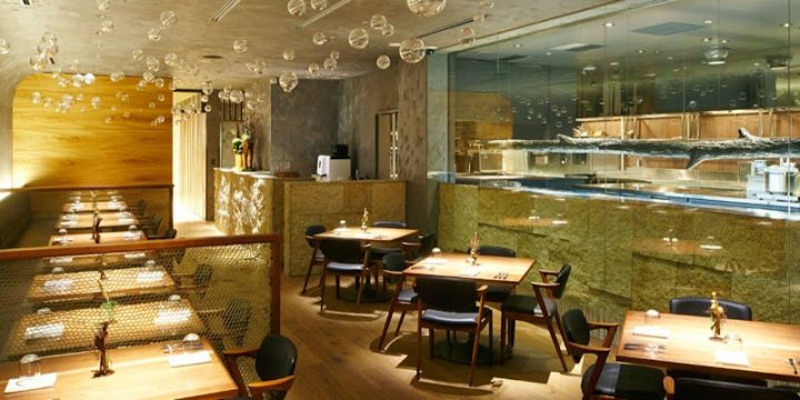 あべのハルカス近鉄本店タワー館の14階にある「エ・オ<ベルナール・ロワゾー・スィニャテュール>」は、シャンパンゴールドの天井から下がったいくつものガラスの球が幻想的な雰囲気を醸す店内が特徴です。フランス料理に日本の伝統美を融合させた料理は、目でも舌でも堪能できるものばかりで大変人気があります。