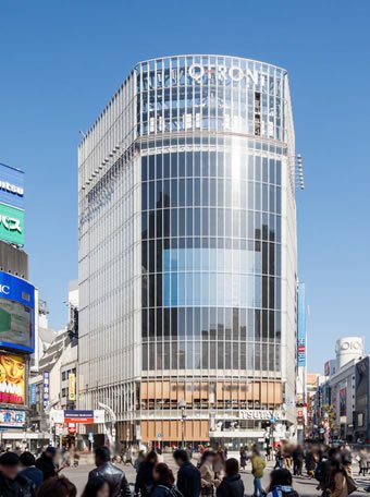 渋谷駅のスクランブル交差点の前に立つQFRONTは、ビルの壁面全体に映し出されるような大型ビジョンが印象的です。ビル内にはスターバックスコーヒーやTSUTAYAなどが入っています。