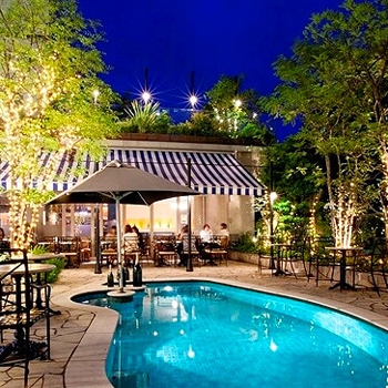 日常を離れ、リゾート気分で女子会を楽しめるのがこちらです。プールが設置されたテラスを木々が彩り、都会にあるとは思えないような穏やかな贅沢空間が広がっています。