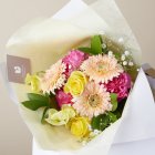 花に詳しくない男性にも馴染みがあり、見る人の気持ちに元気を与えてくれるような明るいイメージの花束になります。
