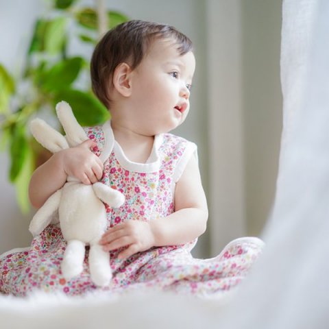 オーガニックコットン100%で作られたスリーパーと、鈴の音がするうさぎのぬいぐるみ。