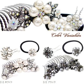 コームとヘアゴム、U字ピンの3点セットで、黒とシルバーを基調としたシックな見た目が特徴のパールヘアアクセサリーです。つやのあるパールが花の形になっていて、華やかで可愛らしい印象を与えてくれます。