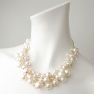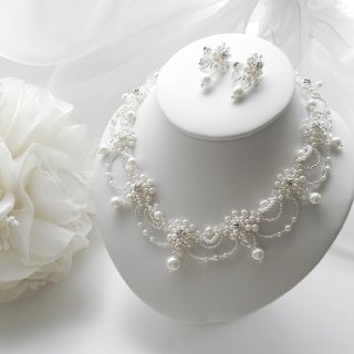 高級感の漂うネックレスとイヤリングのセットは、ドレスによく似合うアイテムです。職人が手作りしたアクセサリーで、たくさんのパールを使用した贅沢さが注目を集めています。