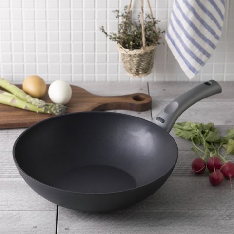 シンプルな見た目がおしゃれな炒め鍋は、表面がチタンコーティングされているので耐久性・耐食性に優れています。また、フッ素樹脂加工によって傷や摩耗にも強く、長く使用できるアイテムです。
