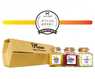 無添加のフルーツと厳選された塩をかけあわせた新感覚調味料を展開しているFlusso。こちらは、3種類のフルーツソルトが入ったギフトボックスです。