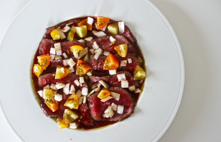 ↑ビューティーソイソース で牛肉のカルパッチョ