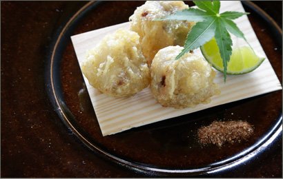 ↑天ぷらに料亭の粉しょうゆを添えて