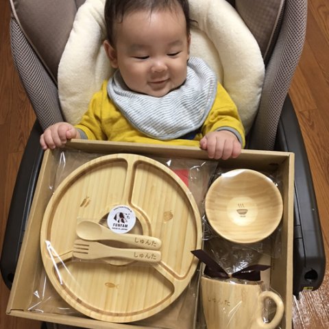 名前、生年月日、時間、出生体重、メッセージなどを刻んで唯一無二の贈り物に仕立てることができる、出産祝いにぴったりのFUNFAMの竹食器シリーズ。