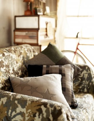 こちらは、ウォッシュ加工されている点が特徴のクッションです。ユーズド感があり、オールドアメリカン風なイメージを演出してくれます。