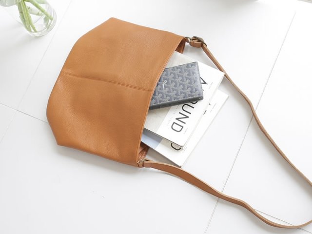 パンツスタイルにもスカートにも合う本革のポシェットは、使えるシーンが幅広く大変便利です。ペットボトルやスマホもしっかりと入るうえ、バッグ本体が360gという軽さも好まれています。