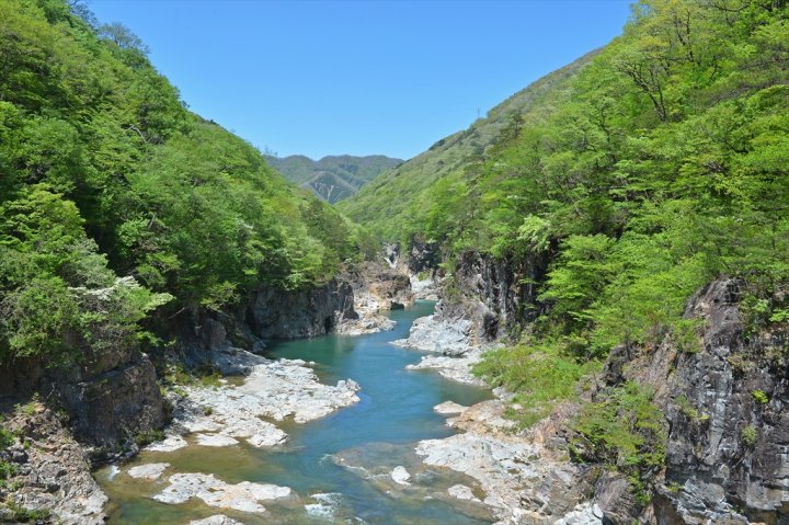 約3kmに渡り清流と巨大な岩が続く「龍王峡」は、まさに龍がのたうち回るような迫力ある眺めです。所々にある滝や橋、茶屋などに情緒を感じる観光スポットでもあります。