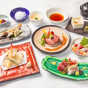 創作和食の「米門」では、全7品もの贅沢なランチコースを味わえます。前菜や煮物、希少部位 牛カイノミ肉のステーキなど、豪華な旬の食材をふんだんに使った和の美味しさを堪能してください。