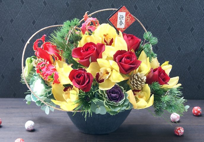 まずはじめに、穏やかなお正月にぴったりの和風のフラワーアレンジメントをご紹介します。どなたにもおすすめできる定番のものや、キュートで明るい色合いのアレンジなど5アイテムを厳選しましたので、ぜひご覧ください。