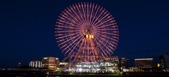 みなとみらいのシンボルのひとつである観覧車は、「よこはまコスモワールド」にあります。世界で初めての画期的な都市計画から生まれた遊園地として注目されており、多くの人で賑わっています。