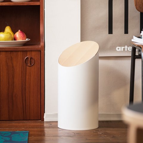 アンブラのダストボックスは、スイングする蓋と緩やかなカーブの形状が特徴です。カラフルながら落ち着きのある色合いで、中のゴミ袋もきちんと隠れるので多くの方に支持されています。