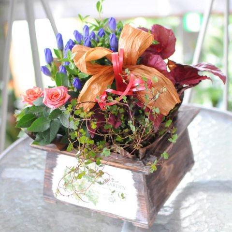 花は5〜6種類とグリーンが1〜2種類がプロによって選定され、バランス良く植えられているのが特徴です。いずれも野に生きる可憐な草花を思い出させる素朴な植物ばかりで、雰囲気の良さがどなたにも喜ばれます。