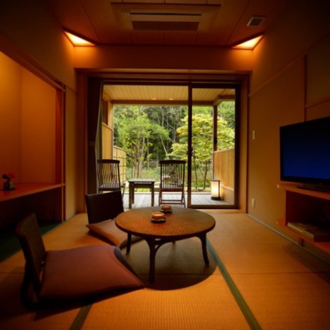 温泉が自慢の「長栄館」は、自然に囲まれた隠れ家的ホテルです。畳のお部屋で食べる食事にも、行き届いたサービスにも、日本の伝統を感じさせる落ち着いた雰囲気が漂っています。