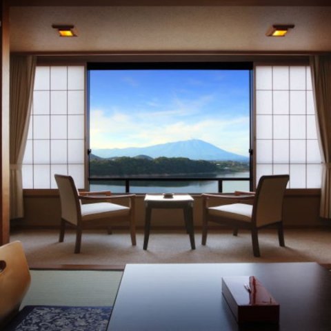 「ホテル紫苑」では、すべての客室から御所湖の景色を楽しむことができます。また、大浴場や露天風呂、貸切風呂など多彩な源泉かけ流しの温泉を楽しめるのも嬉しいポイントです。
