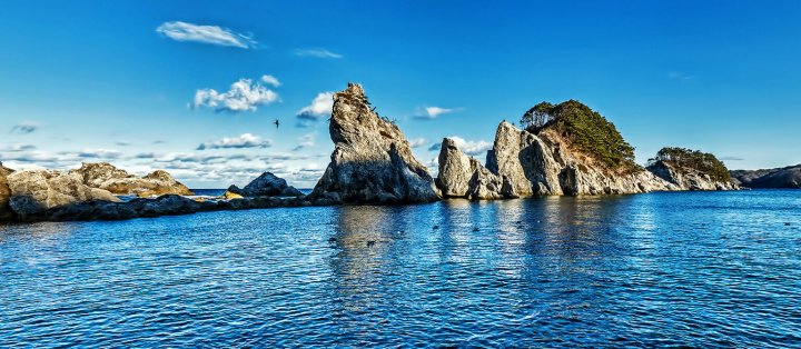 白い砂浜とそびえ立つ尖った巨大な岩が特徴の「浄土ヶ浜」は、岩手県を代表する海水浴場です。シーズンでなくても、その透明度の高い美しい海を見に多くの観光客が訪れます。