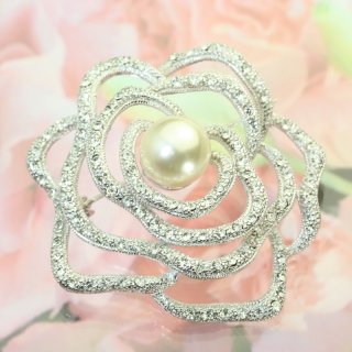 こちらのブローチは、薔薇の花びらの輪郭がスワロフスキーのラインストーンでかたどられており、非常に洗練されたデザインが特徴です。また、中央部分にはパールがあしらわれているため、上品な印象を与えてくれます。