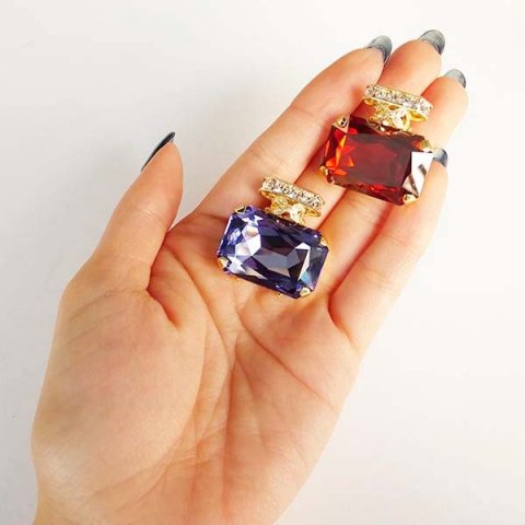こちらは、スクエア型にカットしたスワロフスキーをふんだんに使った存在感のあるブローチです。中央のクリアストーンはクリスタルガラスを使用しており、上品な輝きを放ちます。