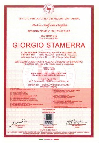 ジョルジオスタメッラは、イタリア政府公認の審査機関(ITPI)から100%イタリア製である認定をもらっている工場です。