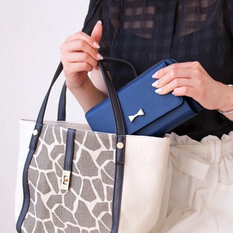 長財布は二つ折り財布に比べて薄く、スタイリッシュなシルエットが美しいことが特徴です。さらに、長財布に多く見られるラウンドファスナーの形状はお札や小銭がスムーズの取り出せます。リボンの装飾が施された長財布は可愛らしさと使いやすさを兼ね備え、幅広い方から愛されています。
