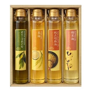 セット内容は、最高品質のオリーブを使用したオリーブオイル、純正胡麻油、綿花の種子の食用油である綿実油、アレルギーの方にも安心な米油の4種類です。あらゆる料理で使い分けることができるので、料理のバリエーションも広がります。