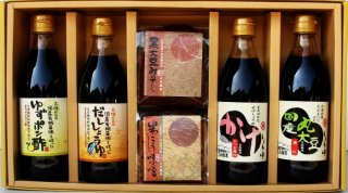 こちらは、バラエティ豊かな3種の醤油、ポン酢、味噌2点が入ったギフトセットです。贈り物としてもボリューム感があり、受け取った瞬間に喜びの声があがります。