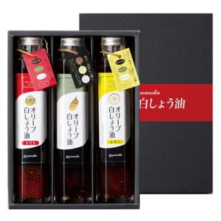 3種類が入ったセットは、爽やかなレモン白しょう油、濃厚なトマト白しょう油、ナチュラルなオリーブ白しょう油です。卵料理やサラダなどにかけるだけで、普段とは違った味わいが楽しめると定評があります。