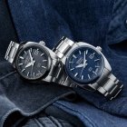ブルーを基調とした文字盤は、黒やグレー、ネイビーなどのスーツにも合わせやすく、ビジネスシーンでも活躍します。