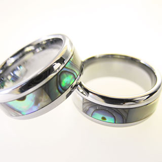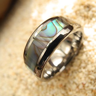 鏡面加工が施されたシャープなシルバーの輝きを放つ指輪と、七色の光彩を見せる貝殻との対比が実にエレガントです。タングステン特有の重厚感も相まって、ラグジュアリー感を感じさせつつもシンプルな上品さがあります。