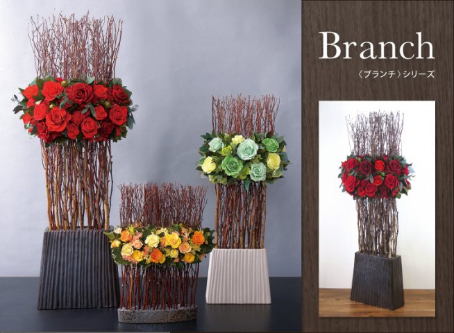 ブランチは、白樺の枝にバラやリーフのプリザーブドフラワーをあしらった、まるで美術品のような商品です。