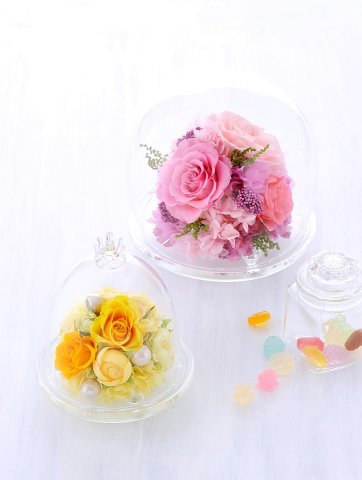 ドーム型にプリザーブドフラワーがアレンジされたガラスドームは、リビングや寝室に飾るのはもちろん、食卓を彩るアイテムとしても最適です。