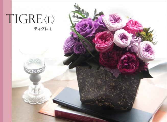 色鮮かなプリザーブドフラワーが上品かつモダンにアレンジされたティグレは、大切な方のお祝いにぴったりのアイテムです。