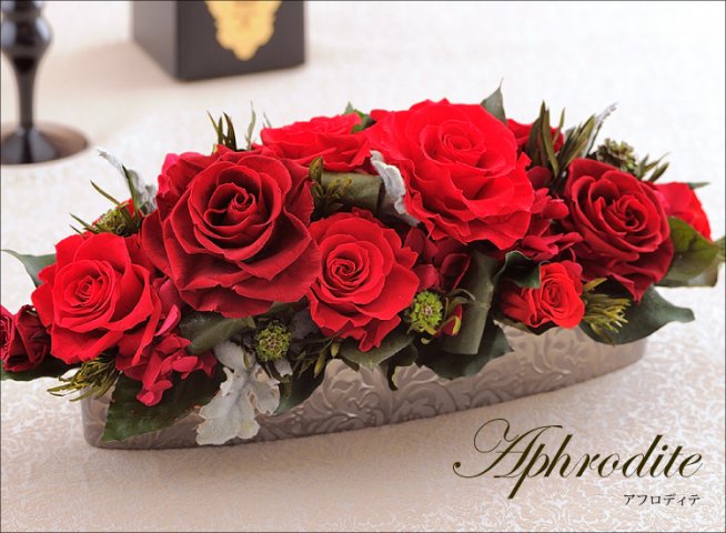 オーバル型の花器に、バランスよく緩やかなカーブを伴ってアレンジされたアフロディテは、食事をするテーブルに飾るのがおすすめです。