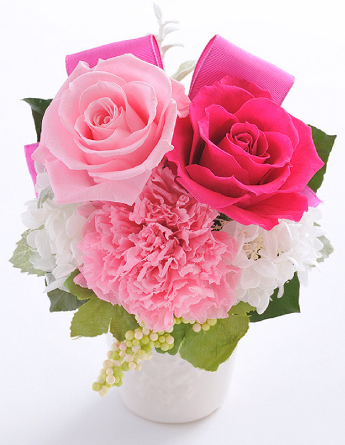 こちらのアレンジメントは、プリザーブドフラワーと一緒にリボンが飾られているのが特長で、楽天ランキングでも1位を獲得しています。