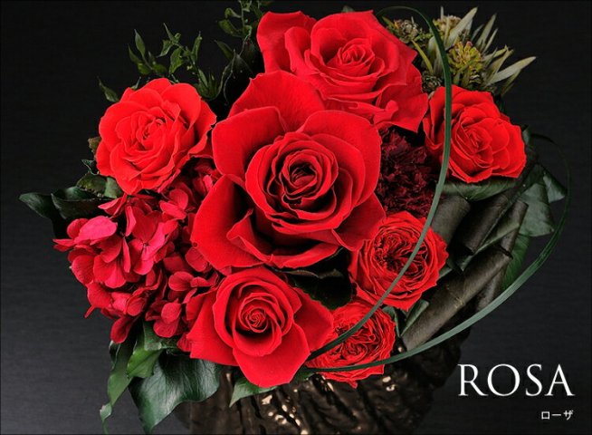 ローザは、真っ赤な大輪のバラとブロンズ調の花器の組み合わせで、モダンなアレンジメントに仕上がっています。