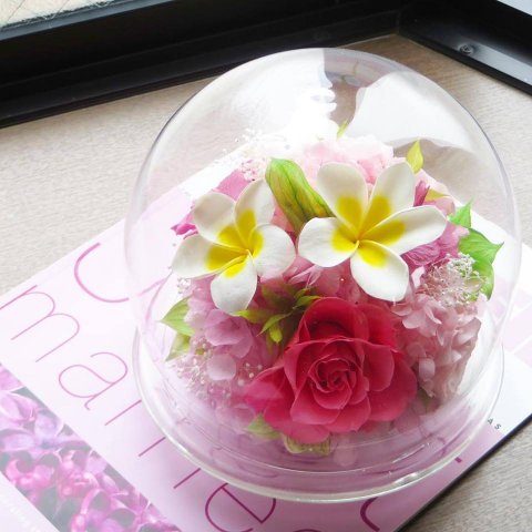 こちらは南国でよく見かけるプルメリアのプリザーブドフラワーを使用したアイテム。フレームの前面にはガラスがはめ込まれているので、ホコリが付きません。