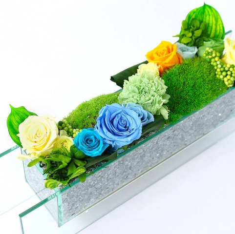 溢れそうなほどに、色あざやかなプリザーブドフラワーをアレンジメントしたヒーリングは、社長室やオフィスの受付に人気のアイテムです。