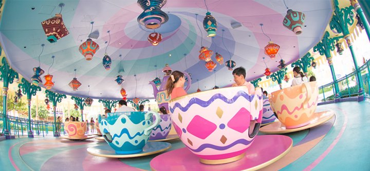 こちらはディズニーランドのアトラクションで、カップに乗ってハンドルを回せば、勢い良く回転します。カラフルでどこか不可思議、それでいてキュートな空間の中、明るく少しスリリングな体験ができます。