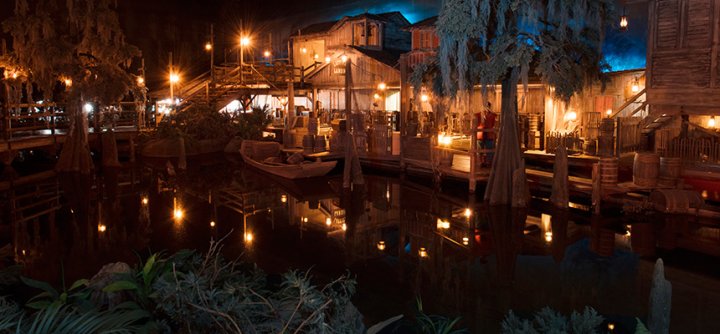 ディズニーランドのアトラクション・カリブの海賊に乗ると、途中、レストランが見えるシーンがあります。それがこのブルーバイユー・レストランで、店内にいながら海や自然を近くに感じる、幻想的な空間が広がっています。