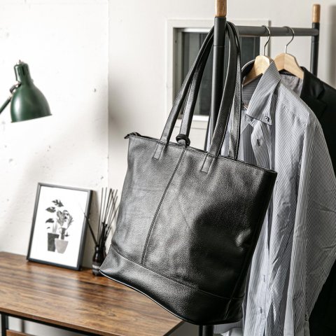 レザートートバッグはユニセックス仕様のシンプルな設計で、メンズファッションにもぴったりです。