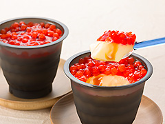 いくらの正体はいちご味のタピオカで、色や大きさなど、すべてにおいて見事にいくらを表現しています。タピオカ独特のプルンとした食感が楽しく、しょうゆに見立てたカラメルソースとの相性も抜群です。