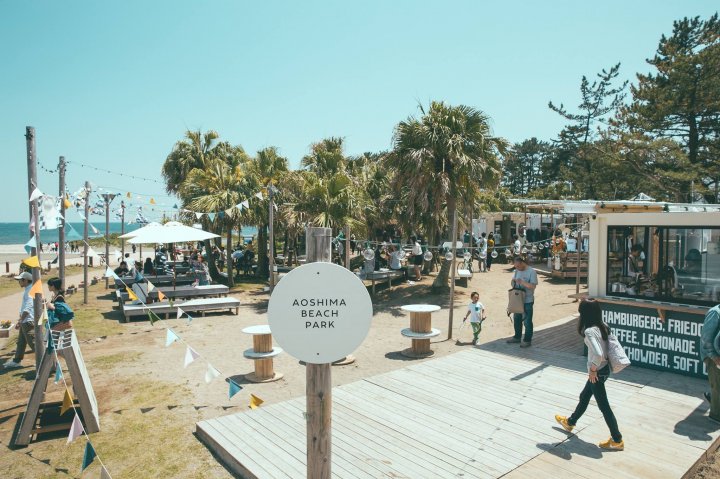青島ビーチパークは、青島海水浴場にて期間限定でオープンするスタイリッシュな現代風の海の家の集まりです。夏にはアップチューンミュージックが流れており、明るい気分になれます。