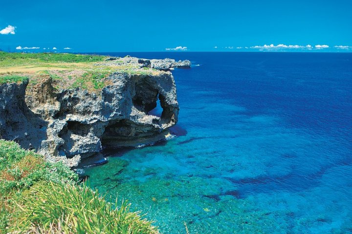 透明度が高く非常に美しいことで有名な沖縄の海。そんな海の美しさを楽しむなら、「万座毛」がおすすめ。万人が座れる草原といわれたことに名が由来しており、広大な草原と象の形をした海岸壁が特徴的です。