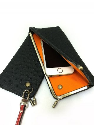 こちらは、オーストリッチレザー仕様のシンプルなスマホケースです。珍しい天溝タイプの口金が使用されているため、生産数が限定されている希少なスマホケースとして高く評価されています。