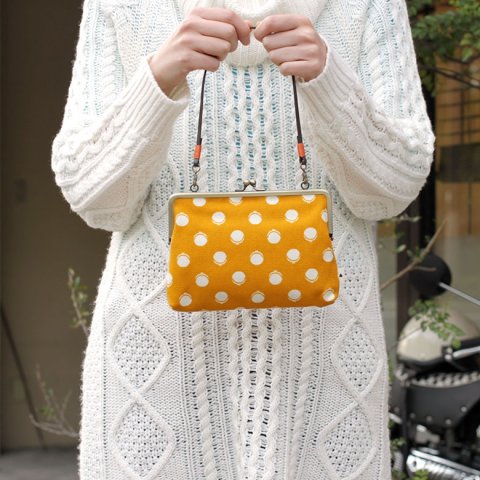こちらは、ドット柄がおしゃれで可愛らしいがま口ミニショルダーです。革製のため、甘くなりすぎないので大人の女性にも似合います。
