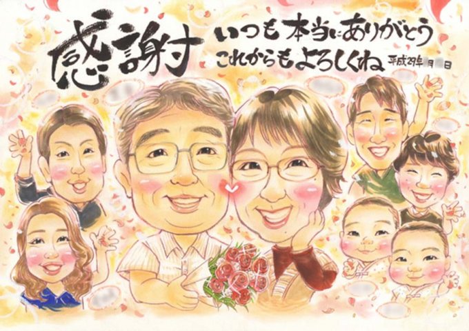 名前やメッセージを入れられる商品もあり、多人数にも対応できるので、家族の記念になる似顔絵を描いてもらいたい方にもおすすめします。