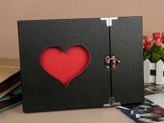 こちらのアルバムは表紙にハートの形の穴が開いていて、そこから思い出の写真を見ることができるキュートなデザインが特徴です。シンプルな黒色の表紙のアルバムは、インテリアとして飾れば部屋をおしゃれに演出します。